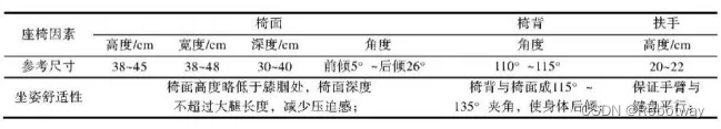 ① 座椅高度:研究表明,为避免大腿下有过高的压力,座位前沿到地面或脚踏的高度不应大于脚底到大腿膝盖的距离。对于青少年而言,椅面高度可调范围以38~45cm为宜,并且应设计为可调整式, 以适应不同用户的身体尺寸。