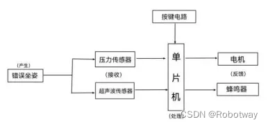 ④ 编写程序,设定传感器响应范围,确保在错误坐姿发生时,传感器能够发生电信号,并由单片机进行下一步工作,到此监测系统设计完成。
