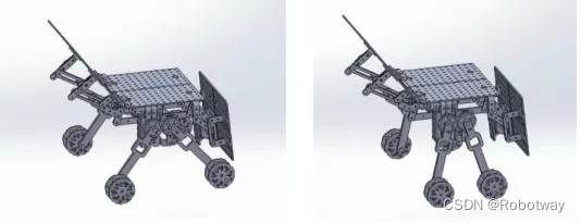 该装置三种模式如下图所示,椅面为固定部分,舵机带动椅面处平行四连杆机构运动,从而带动与其前后两端固连的椅背和膝靠板机构运动,使椅背与膝靠板都能以椅面所在轴线旋转。同时,膝靠板处另设一舵机,控制曲柄滑块机构运动,实现膝靠板单独收放,该装置完成模式变化过程。
