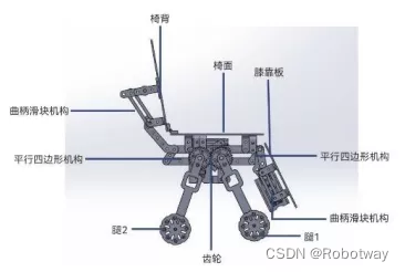 ③ 膝靠板处一组联动式平行四边形与曲柄滑块组合机构;