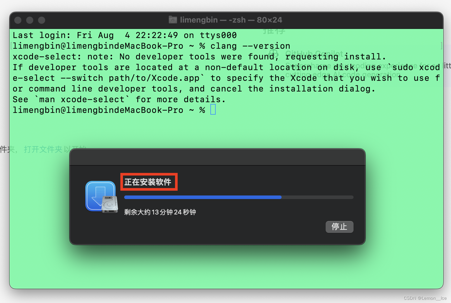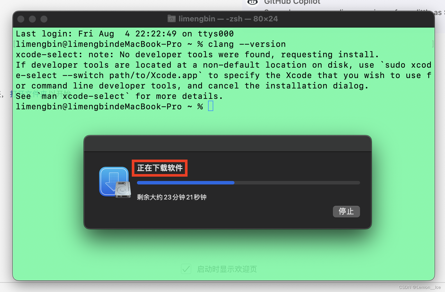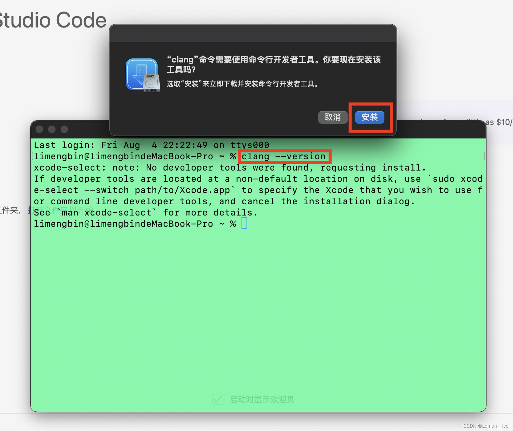如果Clang的安装没有弹出,则在终端中输入以下命令: