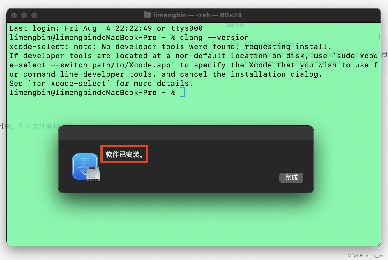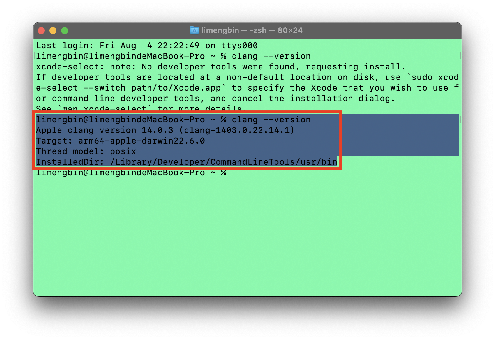 当出现“软件已安装”提示后,则说明Clang已经安装在电脑上了,再次在终端/Terminal中输入之前的命令,会显示有关Clang的相关信息。
