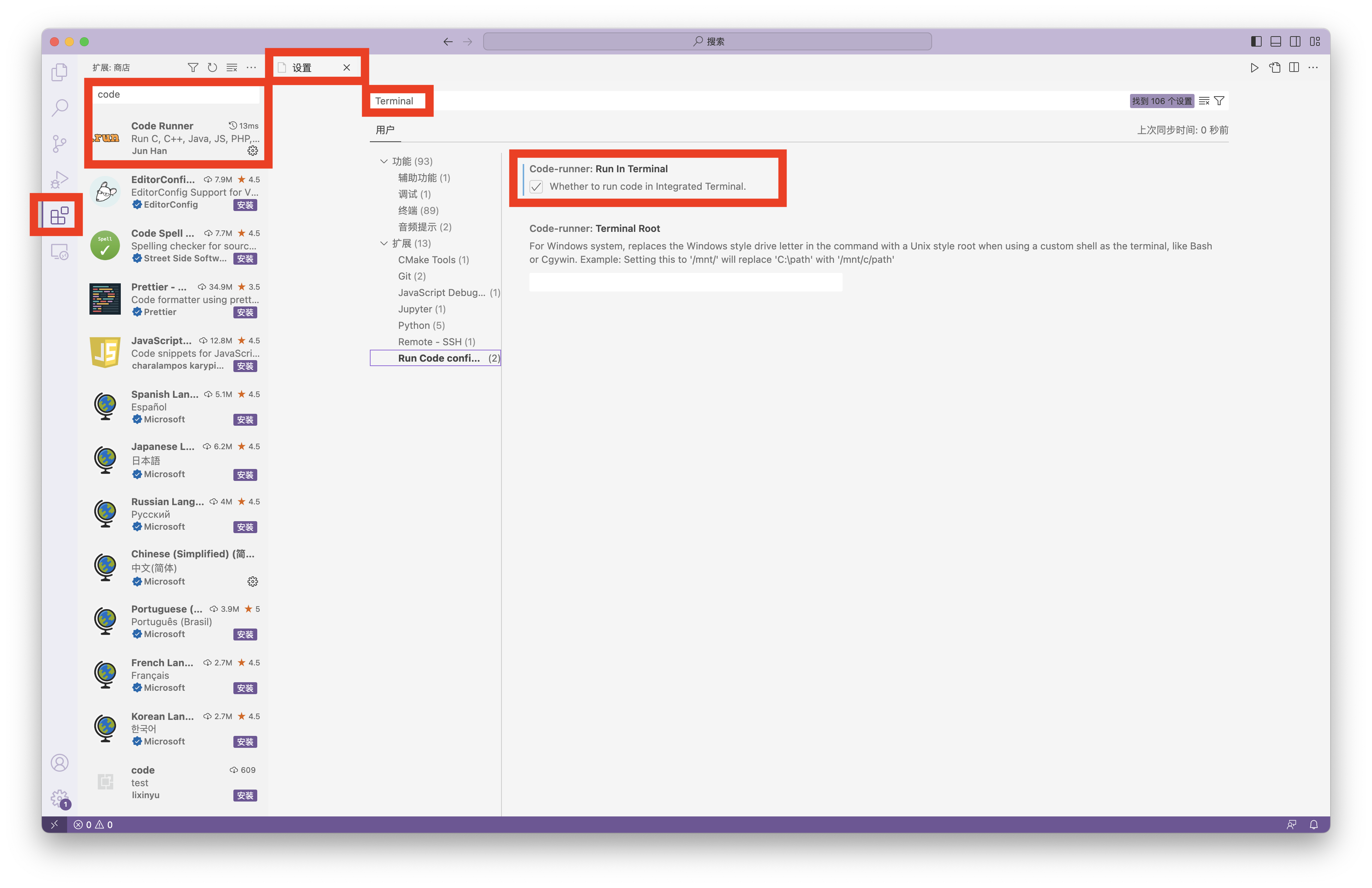 在安装完Code Runner插件后,按住“comman+,”进入设置,搜索“terminal”,在“拓展-Run Code configuration”中找到"Code-runner:Run In Terminal",并把“Whether to run code in integrated Terminal”勾选上。