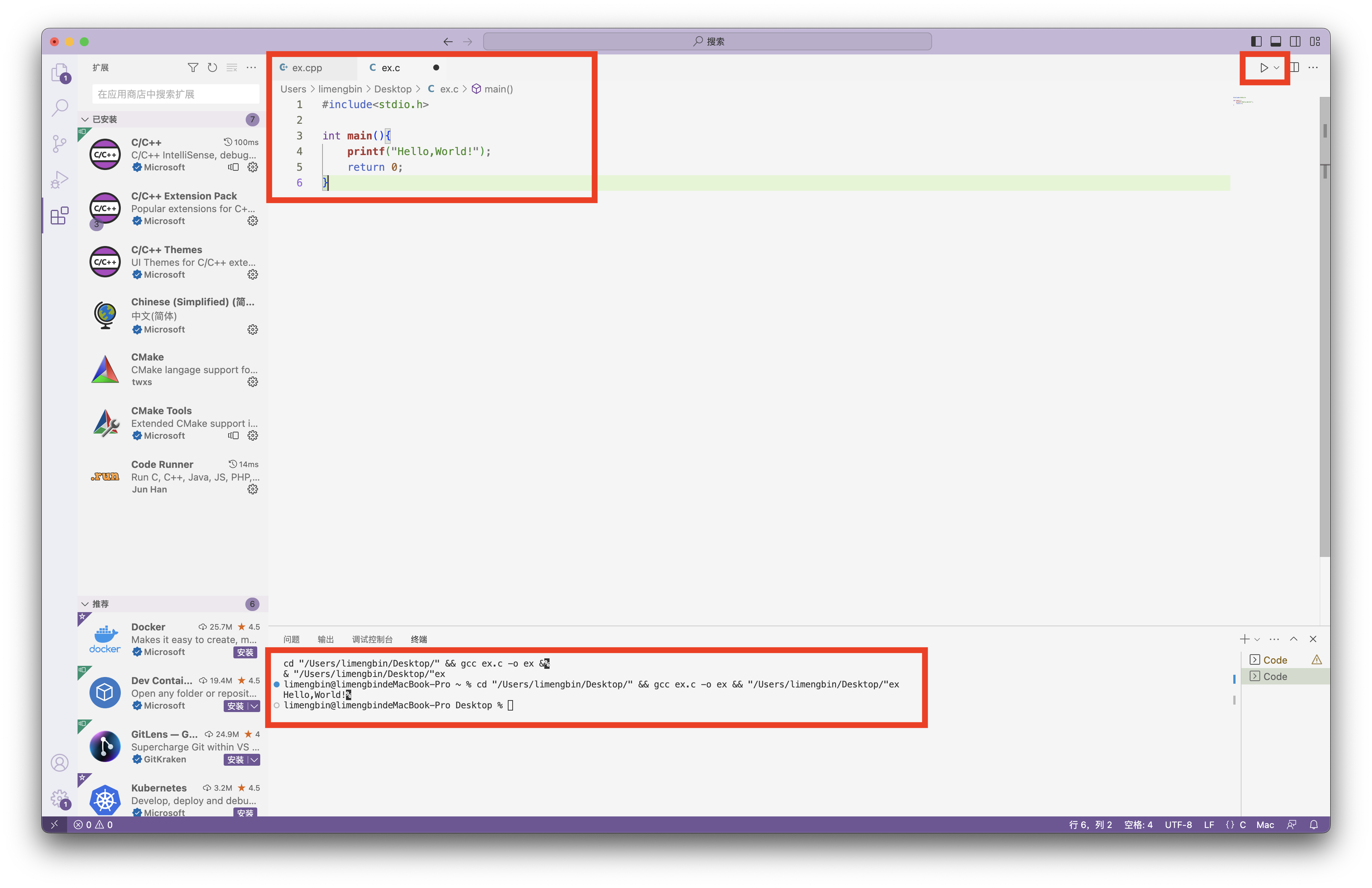 如下所示,点击右上角的运行按钮后(Code Runner插件功劳),即可在下方终端区域出现“Hello,World!”结果。
