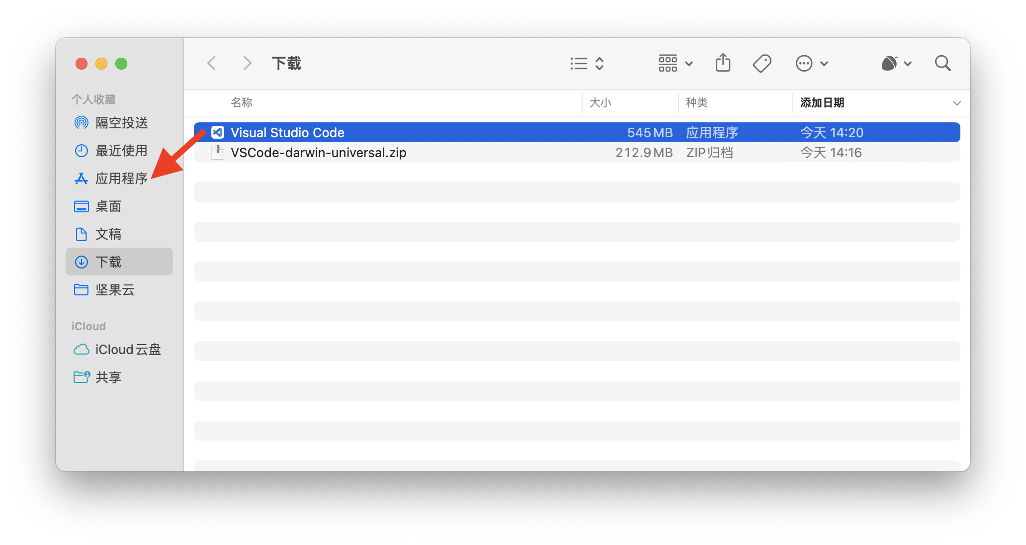 打开VSCode官网网址https://code.visualstudio.com/,点击Download Mac Universal,将文件下载储存至电脑上,在目录下找到下载好的.zip格式文件,双击解压,会出现Visual Studio Code的应用程序文件,将其拖入应用程序目录中,之后就可以在程序坞中找到该应用程序。