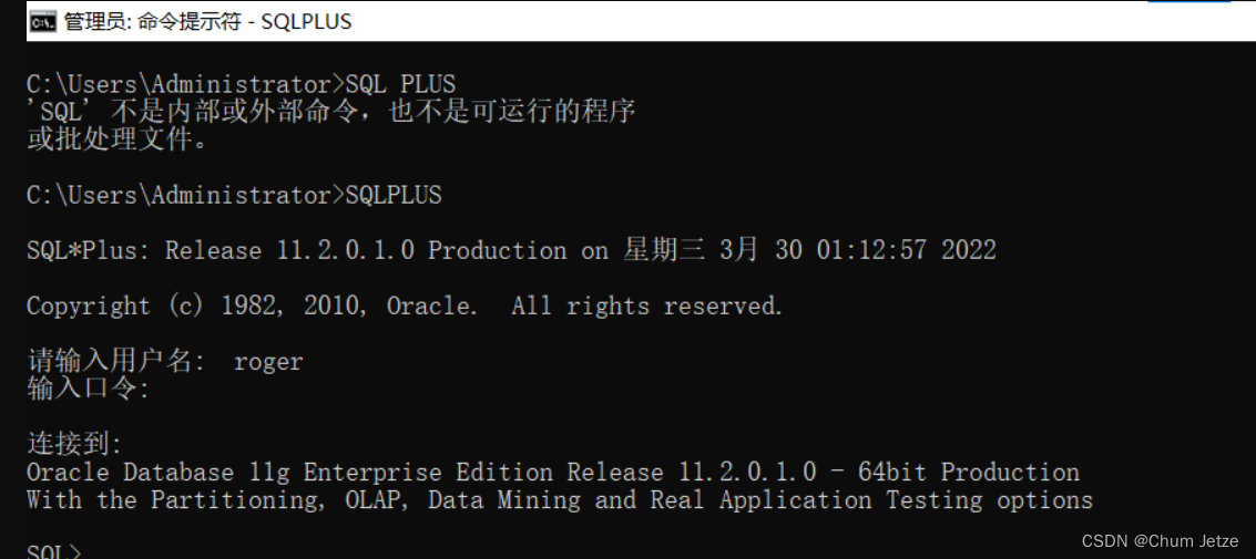 同上,命令行窗口键入代码 SQLPLUS (注意中间没有空格),如果你本地电脑有装ORACLE,则会显示本机安装的ORACLE版本信息,同时也会有输入用户名以 及密码的提示(在SQL * PLUS中,密码不在屏幕显示,甚至也不做为被掩蔽的文本来显示)。输入本地ORACLE的用户名及密码,即可登录本地数据库(tnsname.ora文件要有对应配置,客户端与服务端通过网络来连接时此文件必须有相应配置,当然也在知道服务端IP及端口及服务名的情况下也可以不通过此文件直接连接数据库)。WINDOWS虽然不区分大小写,但ORACLE登录密码有大小写区分