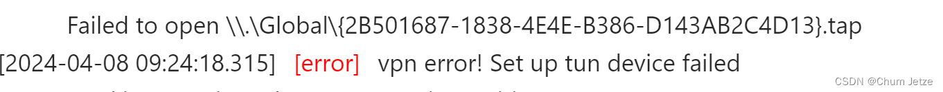 即设置tun设备(TUN 是一种虚拟网络设备,常用于实现网络层(如 IP)的隧道。它是在操作系统内核中创建的虚拟设备,允许用户空间的程序读取或写入 IP 数据包,从而可以在不修改实际网络硬件或驱动的情况下实现自定义的网络行为)时失败。