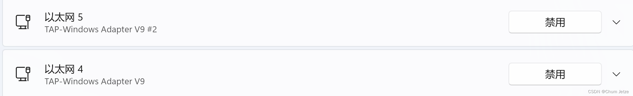 通过设置-网络和internet-高级网络设置,查看所有网络适配器情况,其中TAP-Windows Adapter V9(TAP-Windows/Win32 Adapter V9是一个网络驱动程序,允许VPN连接到其服务器,一般在安装VPN相关的软件时才自动安装此驱动)即本文openvpn与usmappclient所用到的虚拟网卡。在连接openvpn后再连接usmappclient时,虚拟网卡不可用,是由于openvpn已经占用了TAP-Windows Adapter V9此虚拟网卡,所以另一个vpn工具连接时冲突。因此,只需要重新生成一个TAP-Windows Adapter 虚拟网卡即可:将以下文件以管理员运行即可添加。