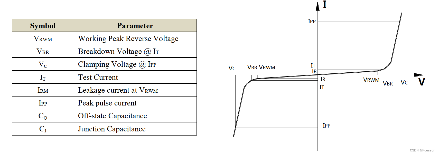1)Vrwm——反向关断电压/截止电压。如果线路上的电压大于Vrwm,则二极管开始反向导通,因此选型时需要注意,Vrwm≥电路中最大工作电压。