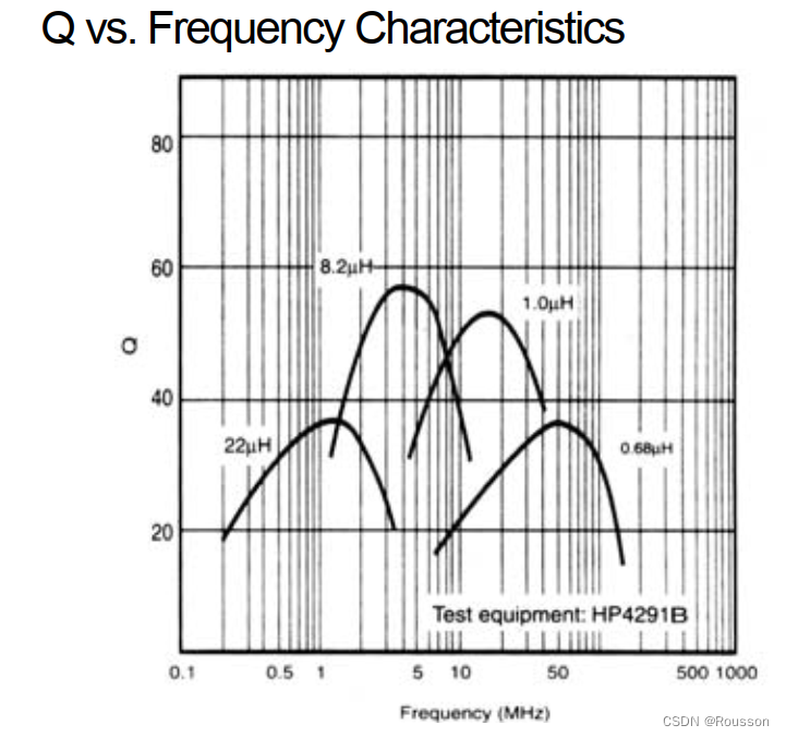 Q 是表示电感质量的一个重要参数。 Q 值的大小, 表明电感线圈损耗的大小, 其 Q 值越大, 线损耗越小; 反之,其损耗越大。以下为某电感Q值与频率的关系图。