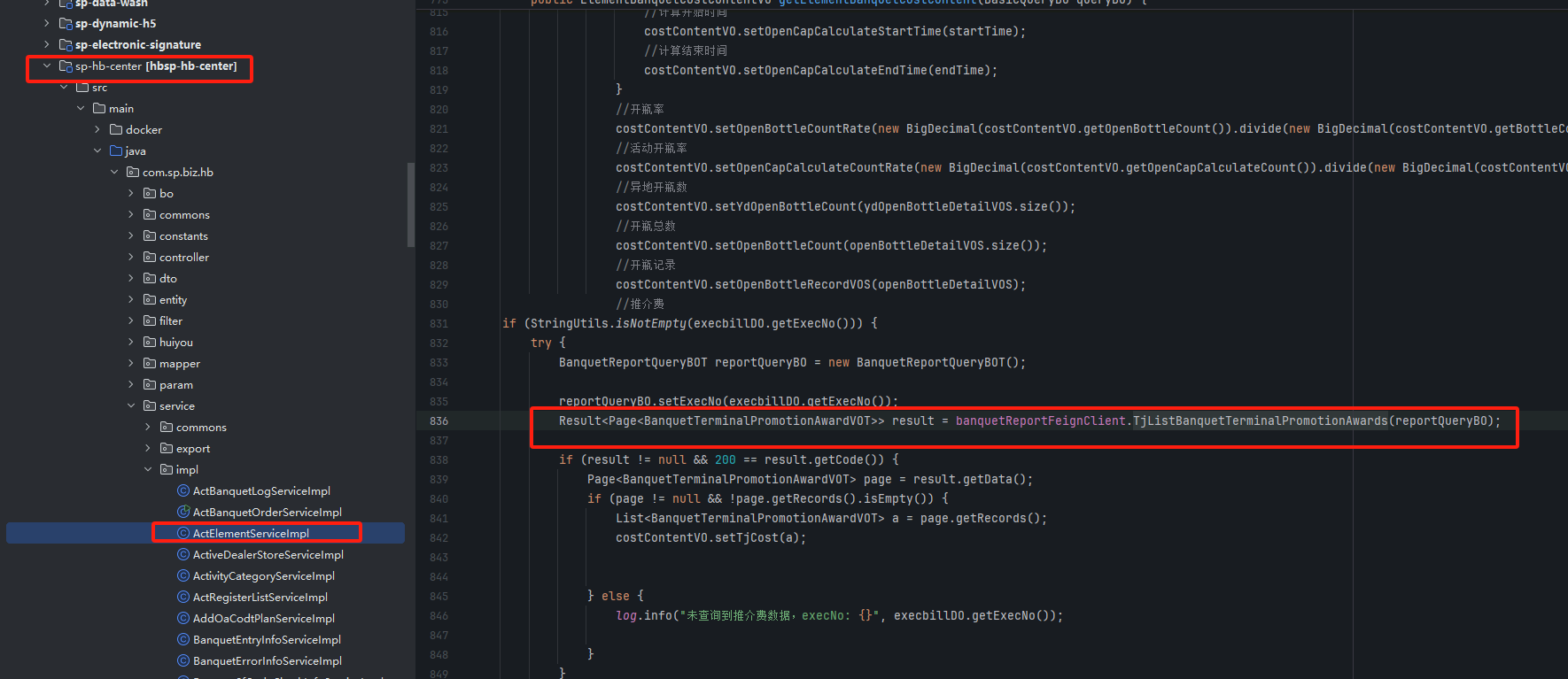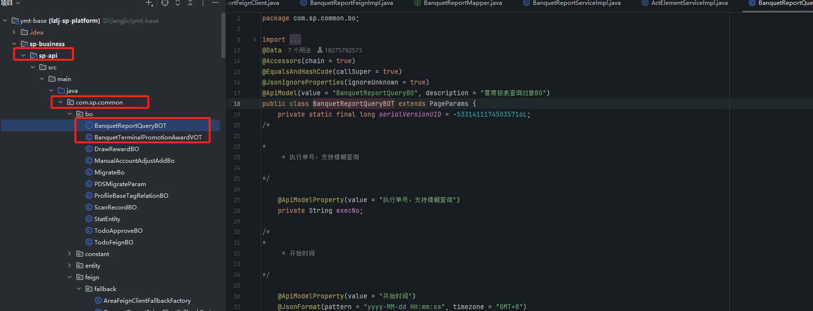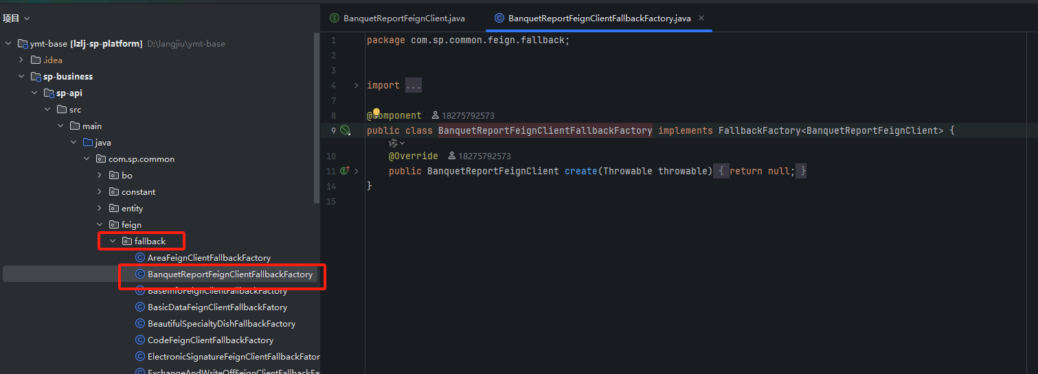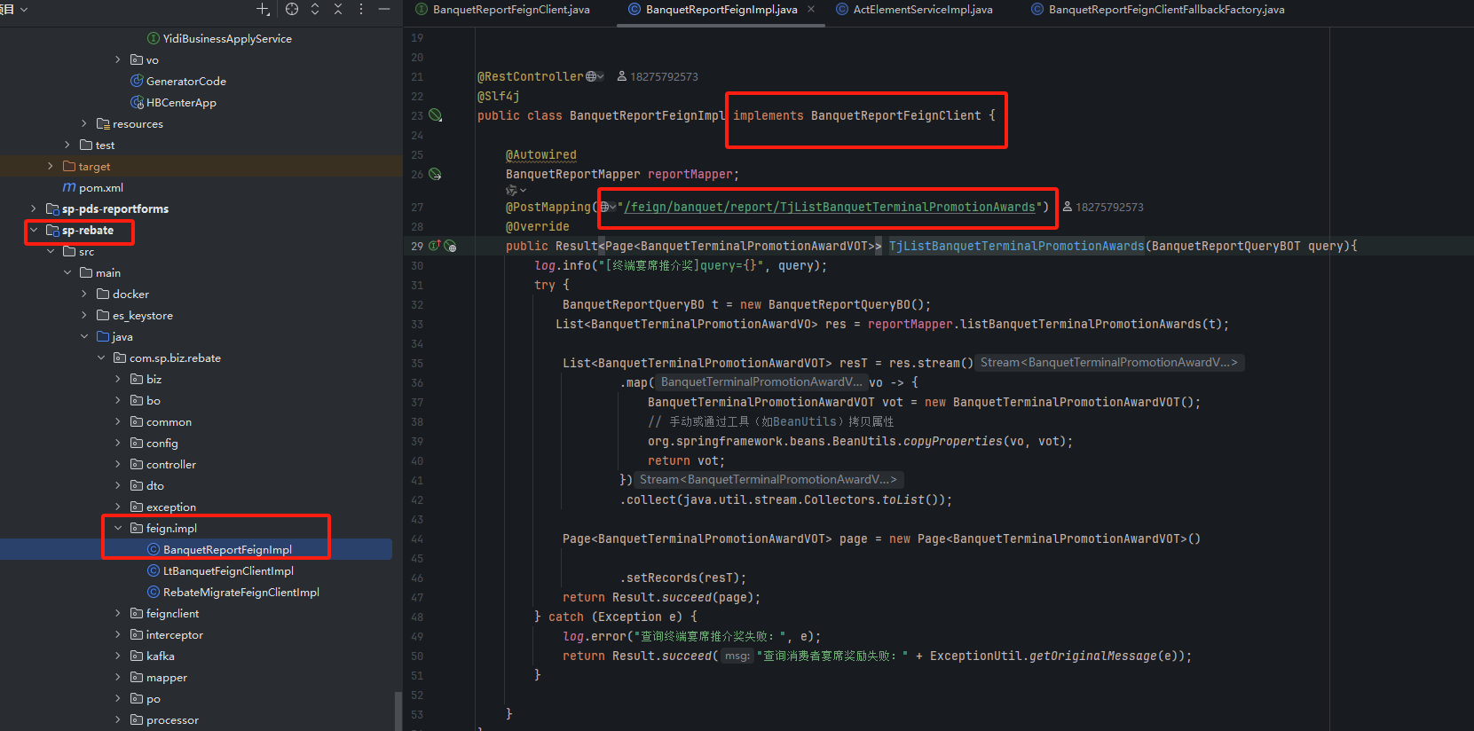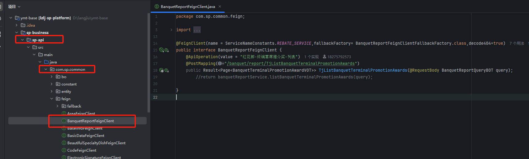 为了实现从sp-rebate服务调用获取推介费的方法放到sp-hb-center服务里使用,先在公共api项目里的common包下新建一个FeignClient接口以便调用,在sp-rebate里实现Feign推介费的业务逻辑,包括实现类Impl的创建和编写,已知sp-rebate原先就有获取推荐费的接口、service类、Mapper类,在xxFeignClient接口重构sp-rebate里已有的推介费接口逻辑,并在sp-hb-center服务相应的实现类的方法里直接调用即可,不需要在sp-hb-center再写业务逻辑实现类了。具体操作参考下类各图示: