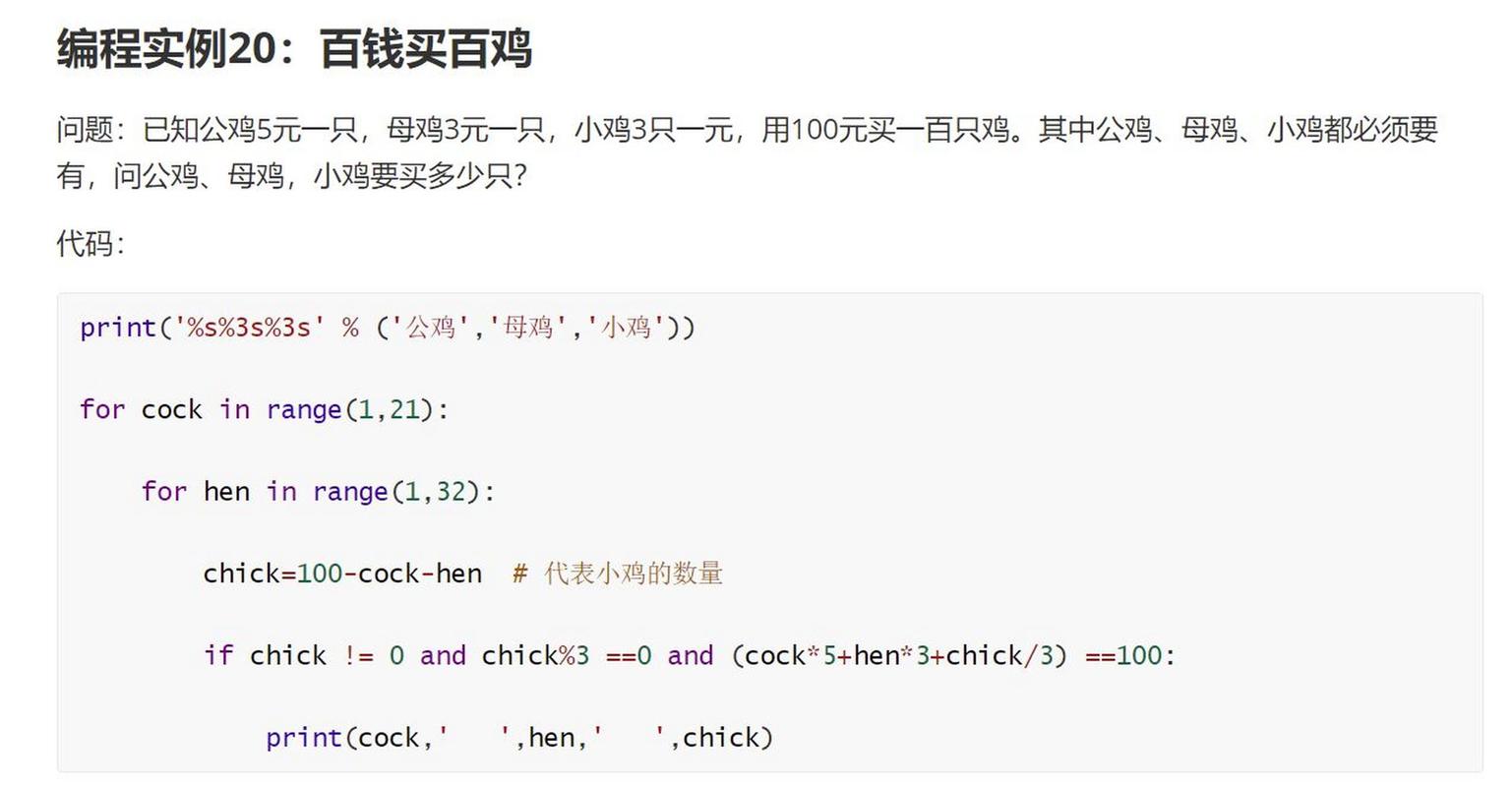 大家好,本文将围绕python百钱买百鸡问题,共有几种方案展开说明,python123百钱买百鸡从小到大排序是一个很多人都想弄明白的事情,想搞清楚python百钱买百鸡问题编程答案需要先了解以下几个事情。