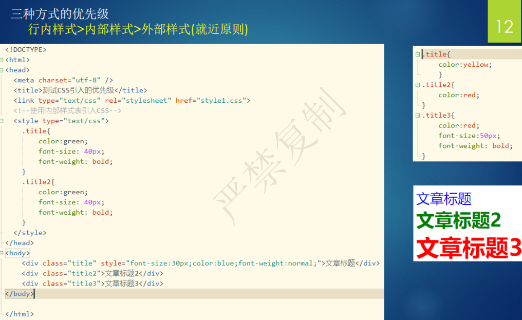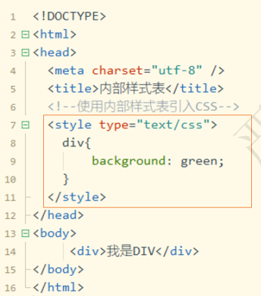 2.内部样式表,在style标签中书写css代码。style标签写在head标签中。