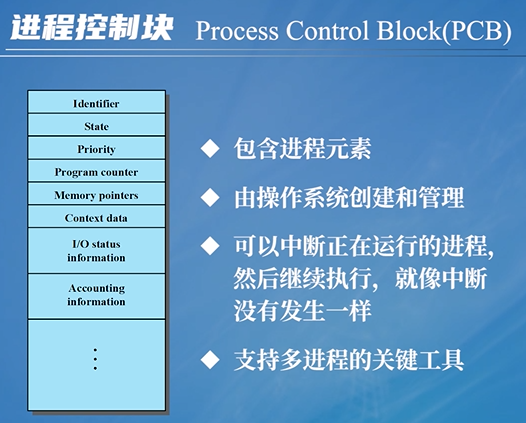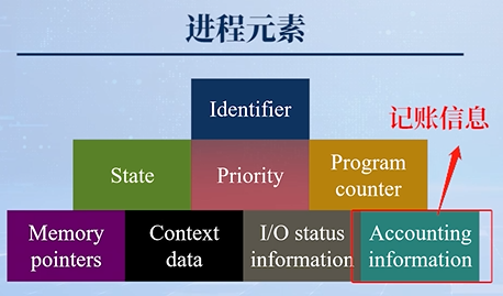标识符,状态,优先级,程序计数器,内存指针,上下文数据,I/O状态信息,记账信息:
