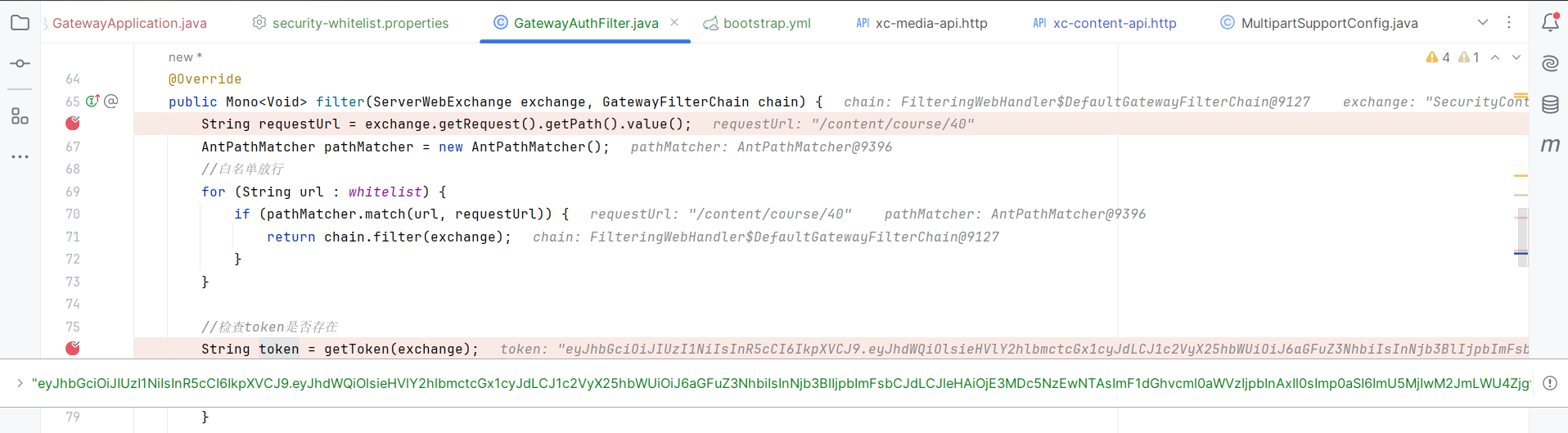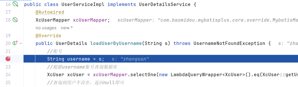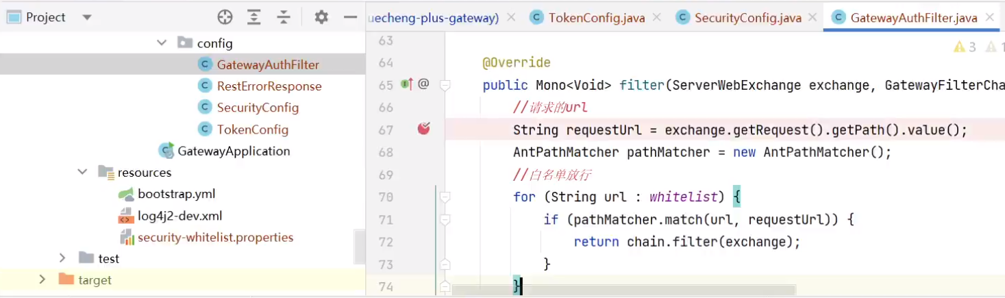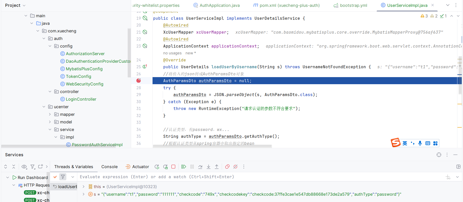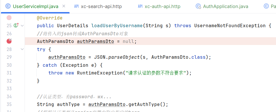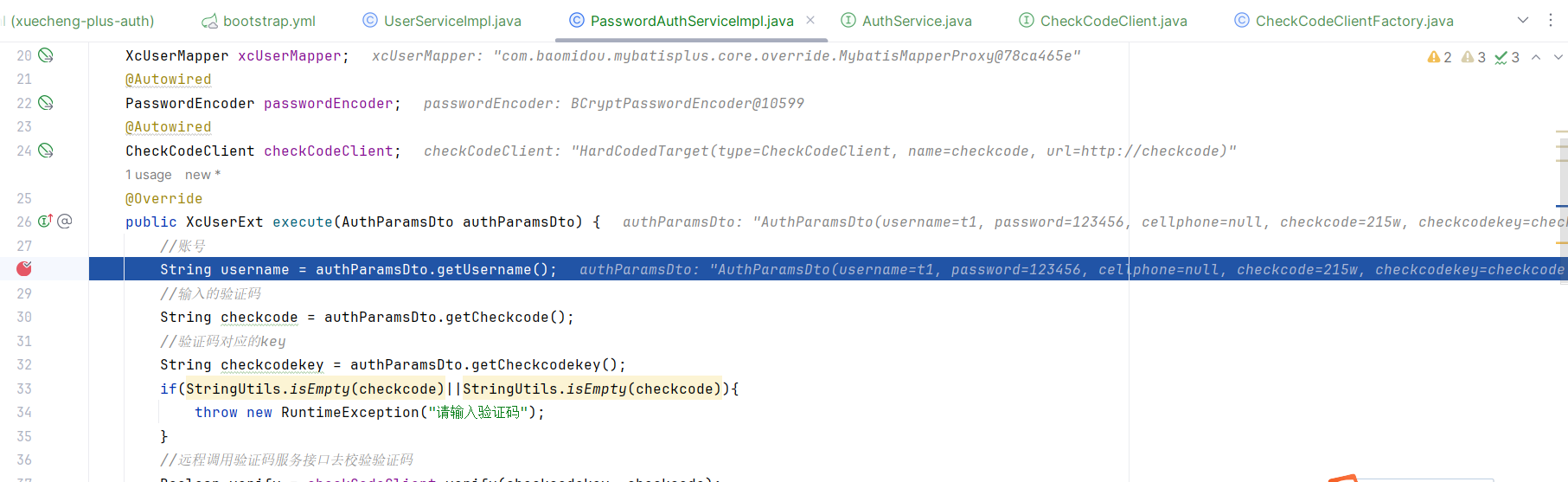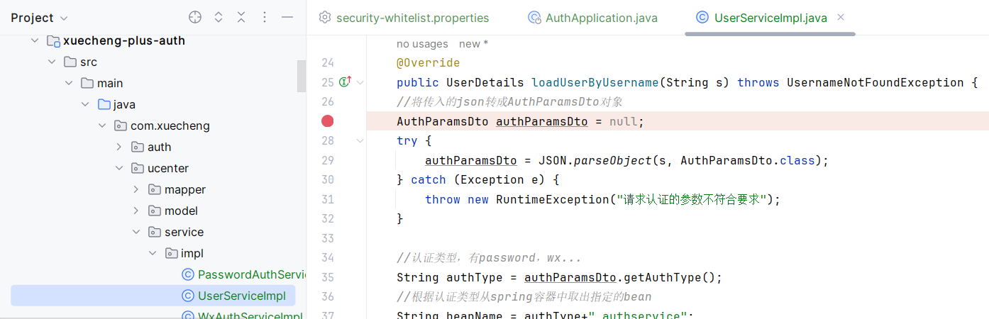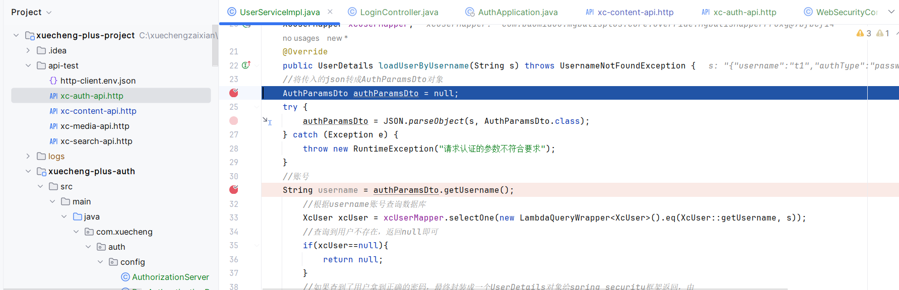 然后可以将xuecheng-plus-auth服务也断点启动,在如下位置打上断点: