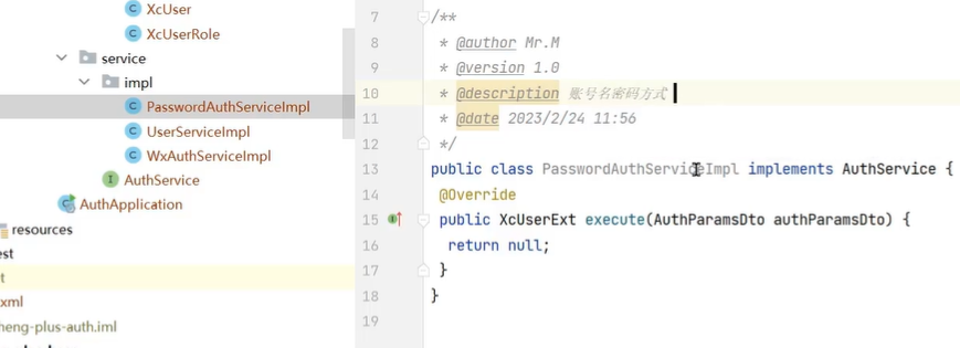 在xuecheng-plus-auth的service的impl下的PasswordAuthServiceImpl中,写入如下代码: