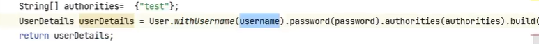 UserDetails userDetails = User.withUsername(userJson).password(password).authorities(authorities).build();