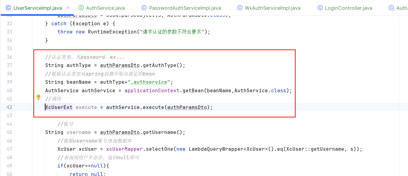 第7步:可以在UserServiceImpl中根据认证类型从spring容器中取出指定的bean。在如下位置添加如下代码: