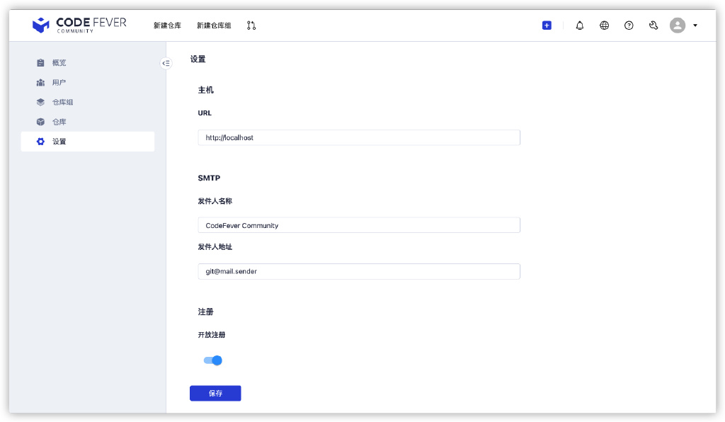 建议大家在这里首先更改一下URL为自己的IP地址、域名,这样将来克隆仓库或者push/pull的时候都不会出错,保存之后回到首页,就可以尝试建立仓库了。