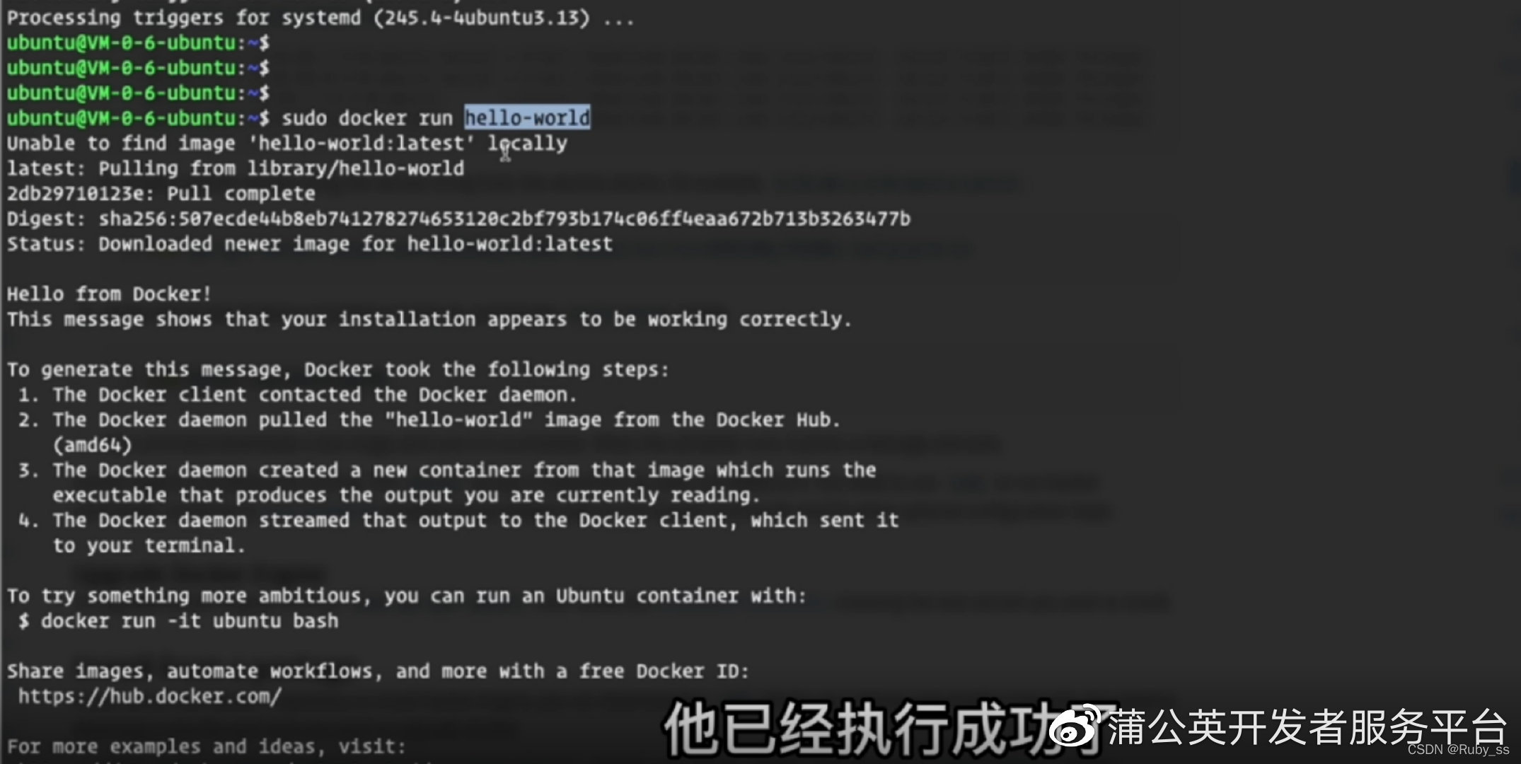 安装完成后,使用sudo docker run hello-world尝试运行。