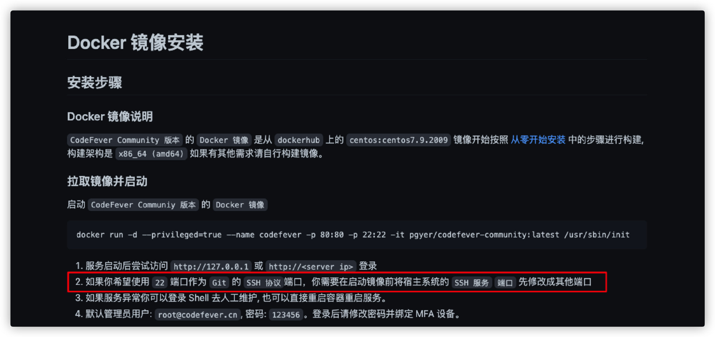 那么如果我们Codefever Community使用22端口的话,那么宿主机的22端口就需要释放出来,不然的话他可能就会冲突,所以建议大家先把宿主的22端口改成别的,这样一会直接跑上面的命令就好啦