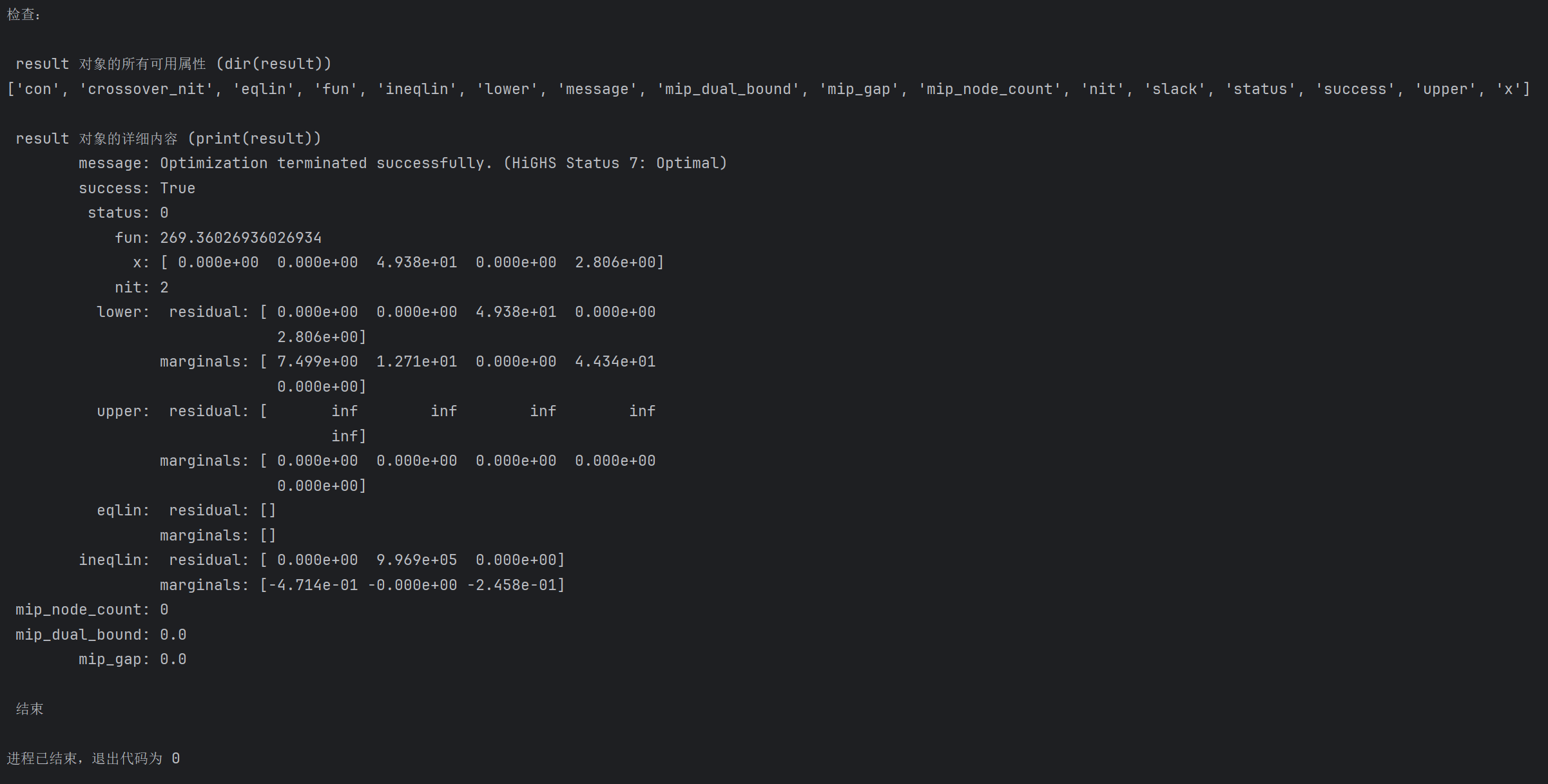 scipy.optimize.linprog函数在不同版本之间,其返回的OptimizeResult对象的结构可能会略有差异,可能有时候还是可以出结果的,但是也会有报错。为了解决这个问题,我们可以利用dir()和print()就拿我的环境举例: