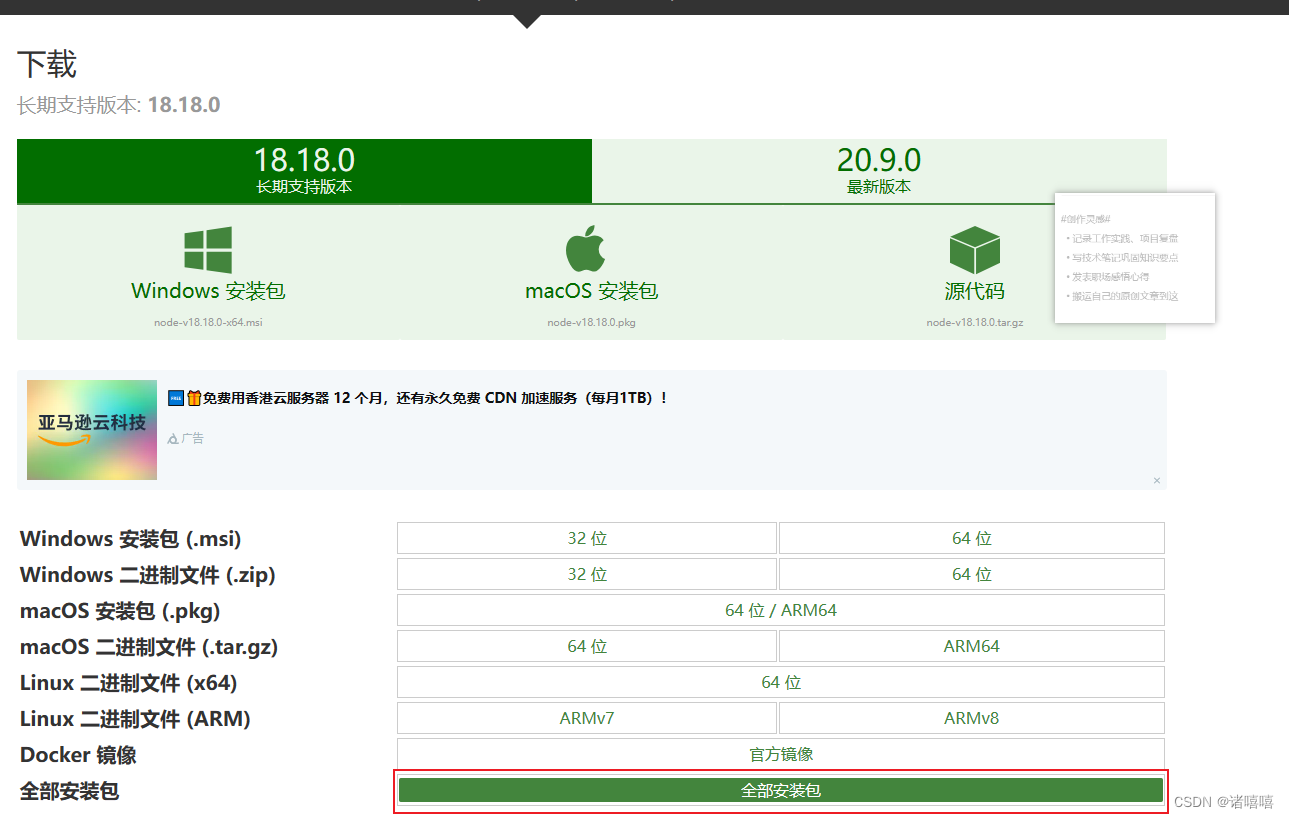 ● 进入 nodejs中文官网,点击下载安装,进入 全部安装包 界面