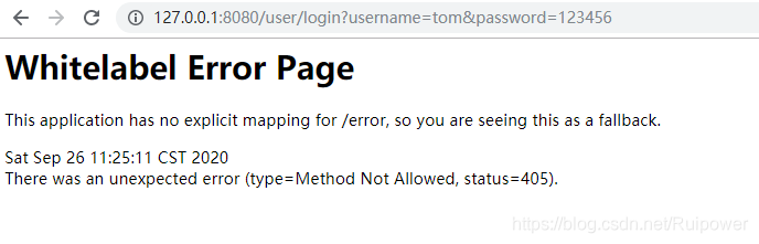 第二个是因为虽然配置了/user/login的放行,但经过debug发现拦截器拦截了请求,并且拦截的是/error,将拦截器注释掉发现,浏览器报405,代码中是用PostMapping去映射的,form表单提交默认是get请求,所以指定成post提交即可。