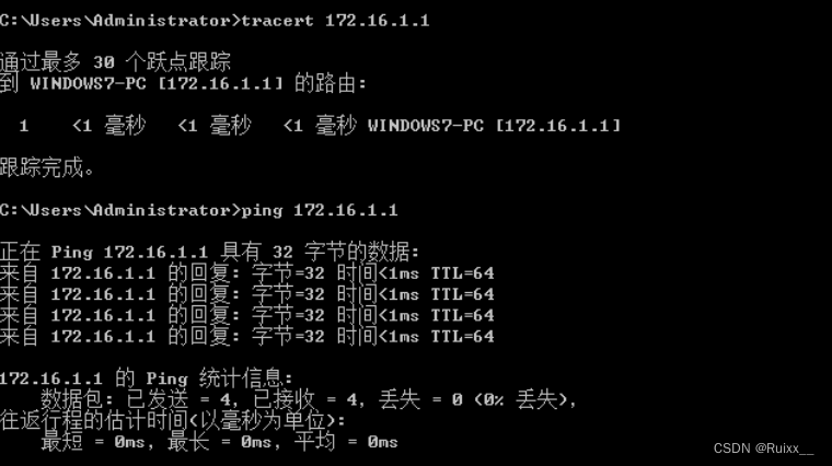 输入ping 172.16.1.1查询ip数据包通过的路径,tracert 172.16.1.1对其进行跟踪