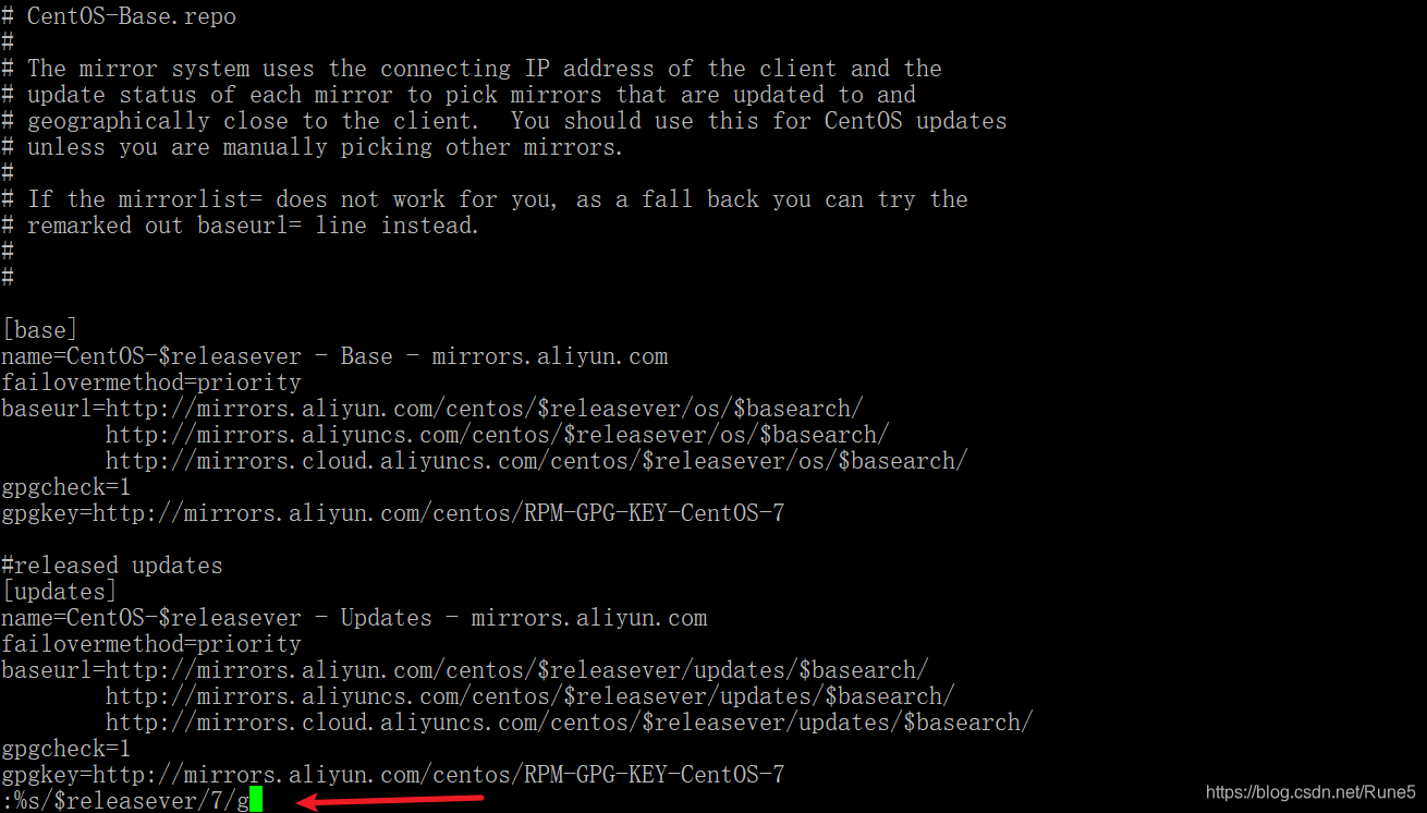 6.按键盘点击 : ←这个符号(需要shift键加冒号键) 然后输入 %s/$releasever/7/g 回车 (g结尾,配合%s 意思是替换所有)