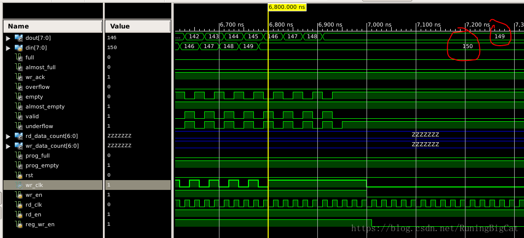 从下图可以发现,实际写入的最后一个数为150,但是由于写时钟写完最后一个数后就停止跳动,当去读FIFO时,无论rd_en和rd_clk一直是有效状态,在FIFO中始终读不出来150这个数