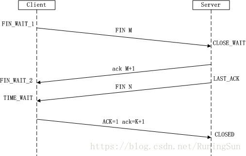 第四次挥手:Client端收到FIN后,Client端进入TIME_WAIT状态,接着发送一个ACK给Server端,确认序号为收到序号+1,Server端进入CLOSED状态,完成TCP连接的关闭。