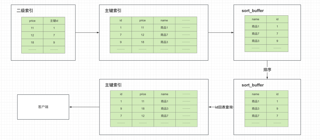 name和主键 id 一起放入 sort_buffer 进行排序 - 根据主键 id 再去主键索引查询全部字段返回给客户端
