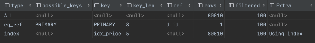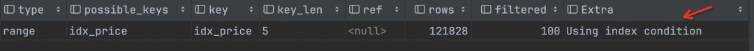 我们发现这条 sql 使用了索引 idx_price,索引结构如下: