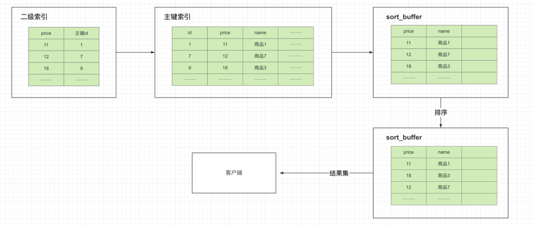 首先会根据二级索引idx_price进行查询找到满足price > 10 and price < 13区间的主键值,因为我们的查询条件是SELECT *,所以需要回表查询到对应的行记录。由于ORDER BY price,我们是需要对查询出来的结果按照价格从小到大进行排序。我们刚刚的数据就是从二级索引idx_price查询出来的,本就是根据price字段排序的,所以无需再排序,直接把查询的数据返回给客户端就行了。