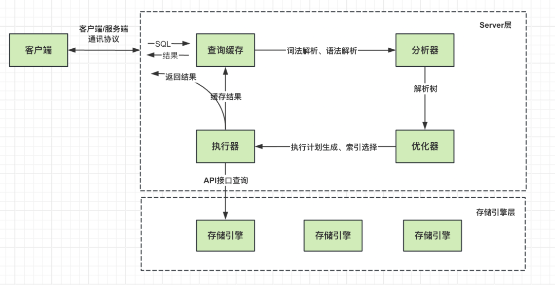 MySQL 可以分为 Server 层和存储引擎层两部分,对于这个就不展开讲了。只需要知道一条 SQL 语句是从客户端发起请求到 Server 层,Server 层处理之后选出成本最低的执行计划去存储引擎层进行数据查询,查询出来的数据返回给 Server 层处理,最后返回给客户端。(存储引擎层根据扫描区间定位拿到数据给到 Server 层,剩下的过滤、排序、分页等操作是在 Server 层载进行处理的)。