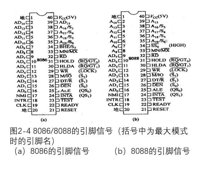 2、8086/8088的引脚差别:(1)8086有16个地址/数据复用引脚,8088有8个地址/数据复用引脚;(2)28脚和34脚定义不同。