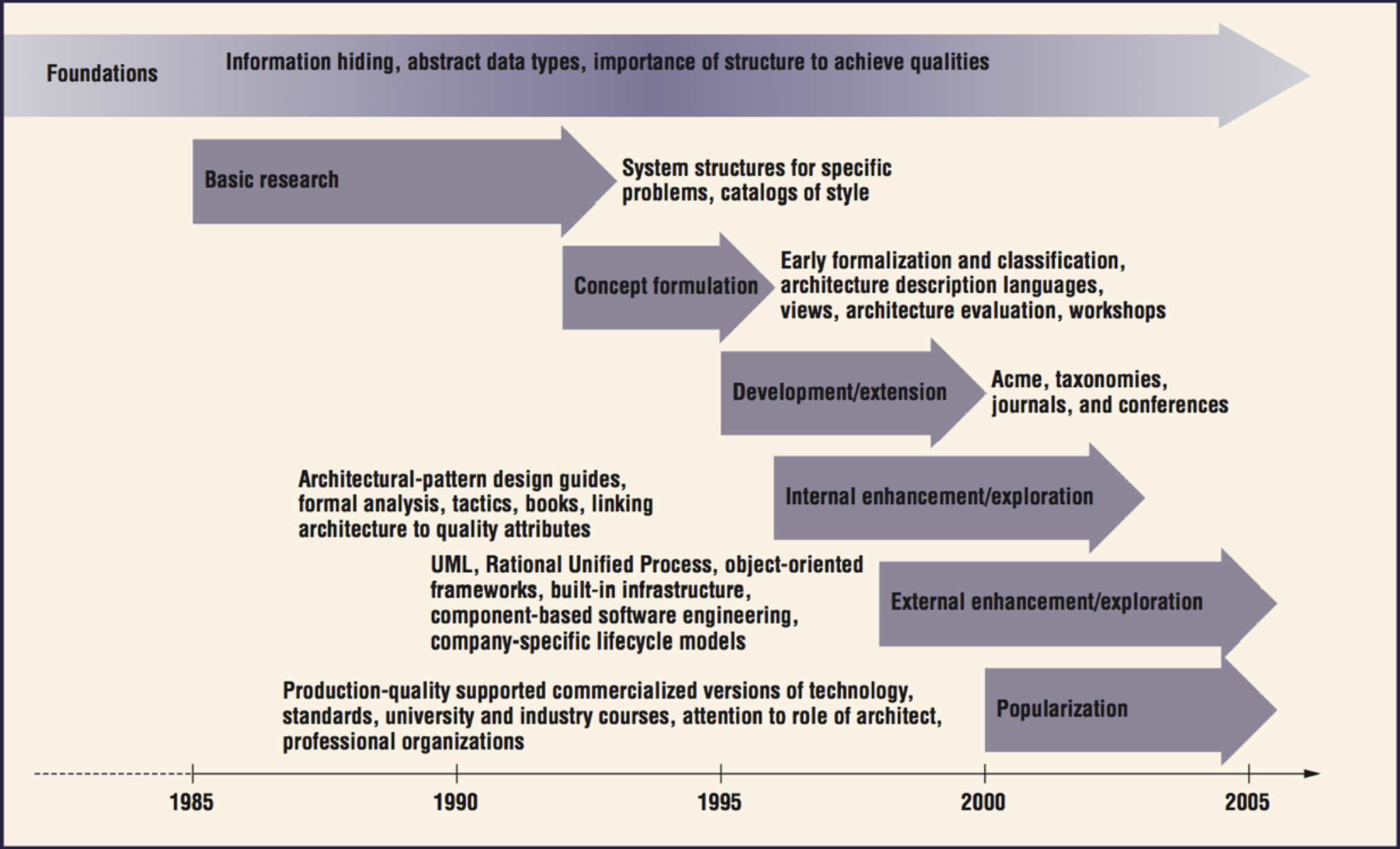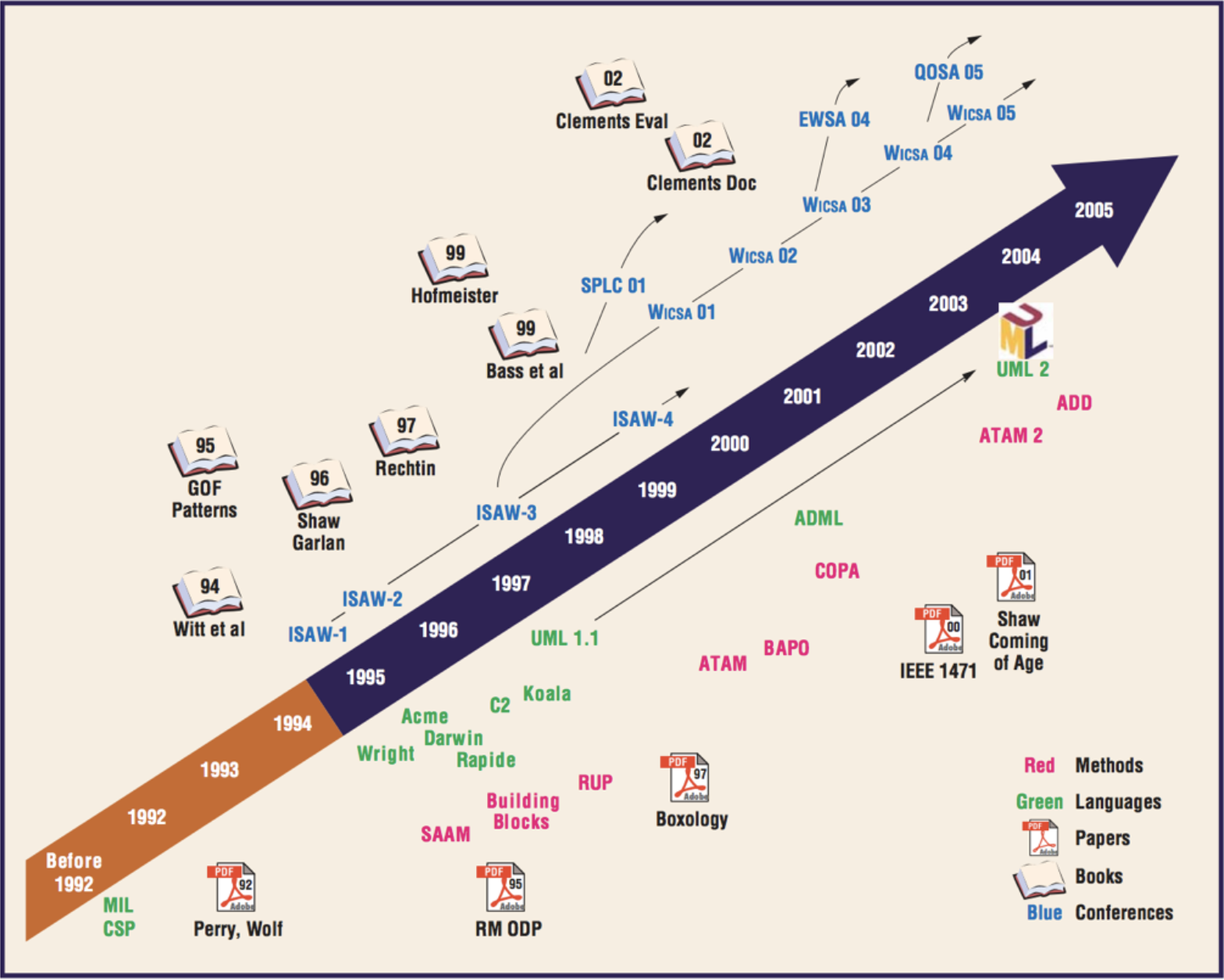 1975到1986,Brooks、Lampson、Parnas等开始研究软件系统的组织,并发表研究成果 - 1992年