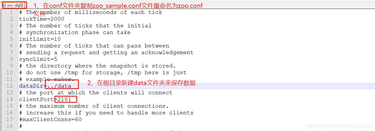 在根目录新建文件夹data,复制配置文件并重命名zoo.conf,修改配置文件zoo.conf的dataDir=../data