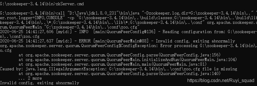 - 在bin目录下直接cmd运行命令zkServer.cmd启动会报错。