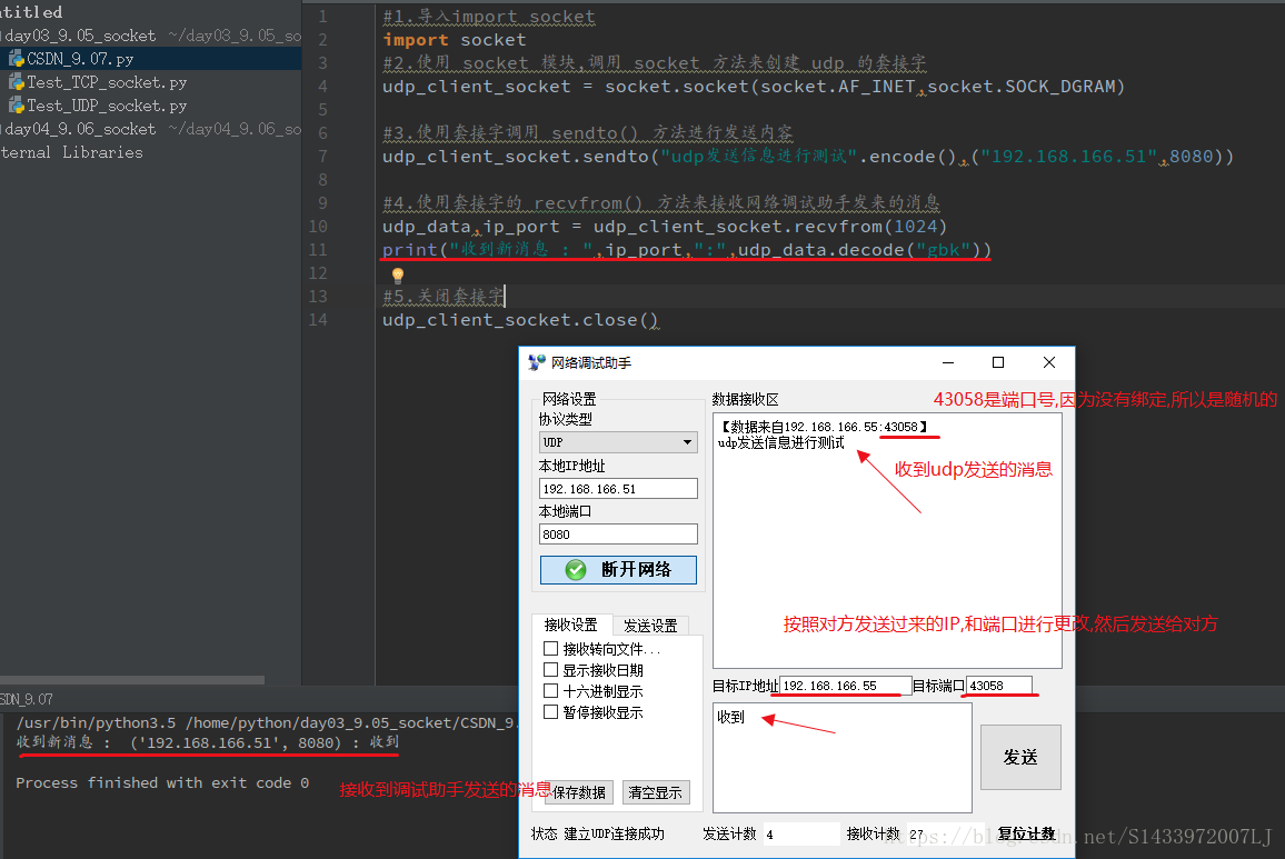 4.使用套接字的 recvfrom() 方法来接收网络调试助手发来的消息