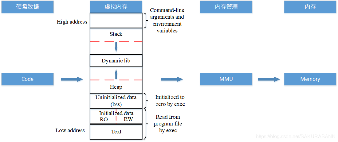 上图表明,硬盘上的程序和数据之间还隔着虚拟内存和 MMU(memory manager unit),硬盘上的程序通过虚拟内存获得内存资源在虚拟内存上的一个映射,然后 MMU 再将虚拟内存中的资源映射到实际的内存单元,从而获得了真实的内存资源,得以运行。