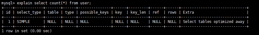 在没有GROUP BY子句的情况下,基于索引优化MIN/MAX操作或者对于MyISAM存储引擎优化COUNT(*)操作,不必等到执行阶段再进行计算,查询执行计划生成的阶段即完成优化