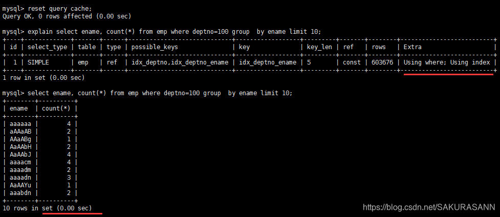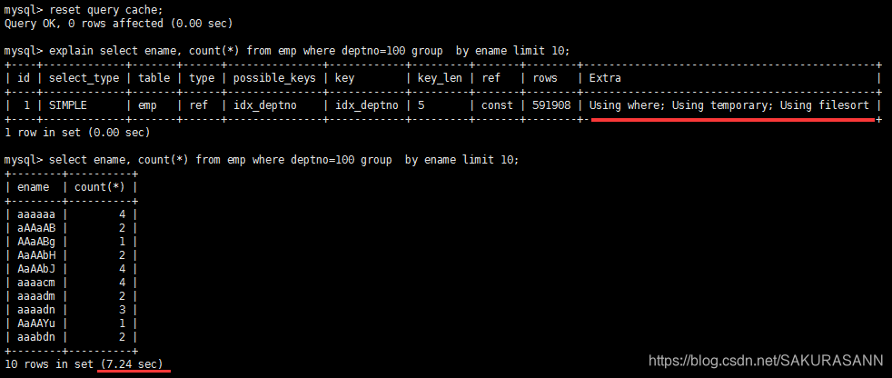 create index idx_deptno_ename on emp(deptno,ename);后解决优化前存在的using temporary和using filesort问题,性能发生明显变化: