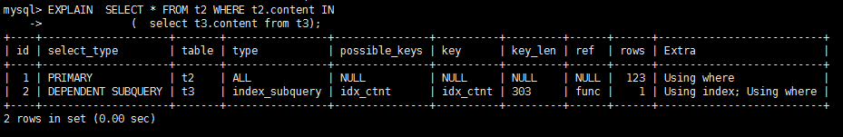 - dependent subquery : 子查询结果为 多值