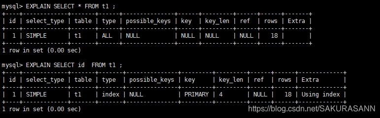 - 对比下图两个sql语句和key的值:当查询具体某一字段时,且那个字段有索引时,key值会显示为索引