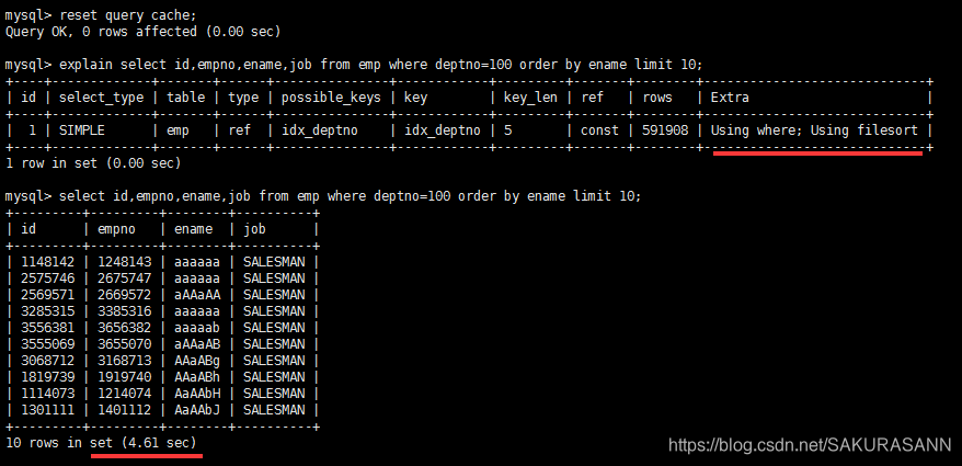 优化后,不再出现filesort的情况(给 ename 加上了索引):