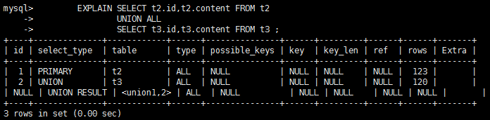 - 若UNION包含在FROM子句的子查询中,外层SELECT将被标记为:DERIVED