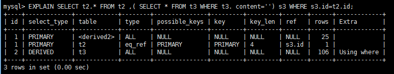 - 衍生表 = derived2 --> derived + 2 (2 表示由 id =2 的查询衍生出来的表。type 肯定是 all ,因为衍生的表没有建立索引)