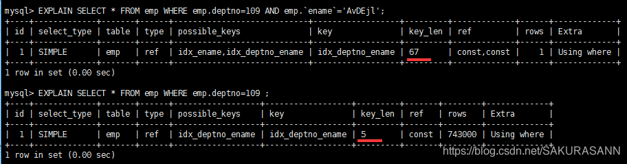 - 第一组:key_len=deptno(int)+null + ename(varchar(20)*3+动态 =4+1+20*3+2= 67